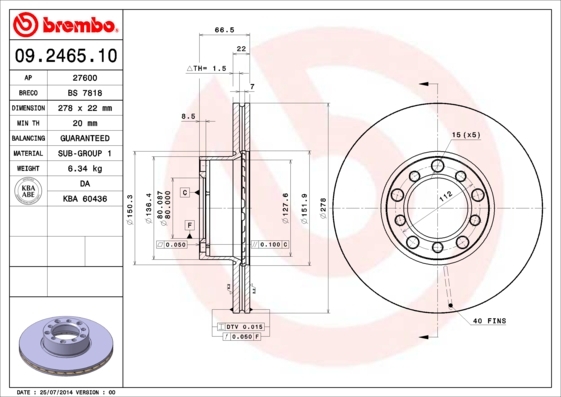Dodatkowe informacje o produkcie Tarcza hamulcowa 09.2465.10 BREMBO