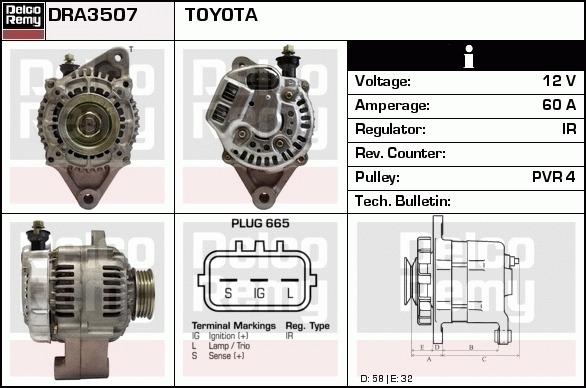 Dodatkowe informacje o produkcie Alternator, Light duty Japan Reman DRA3507 DELCO REMY AUTOMOTIVE EUROPE