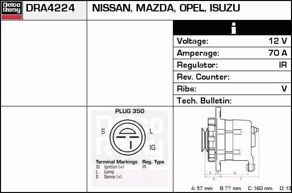 Dodatkowe informacje o produkcie Alternator, Light duty Japan Reman DRA4224 DELCO REMY AUTOMOTIVE EUROPE