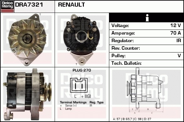 Dodatkowe informacje o produkcie Alternator, Light duty Europe Reman DRA7321 DELCO REMY AUTOMOTIVE EUROPE