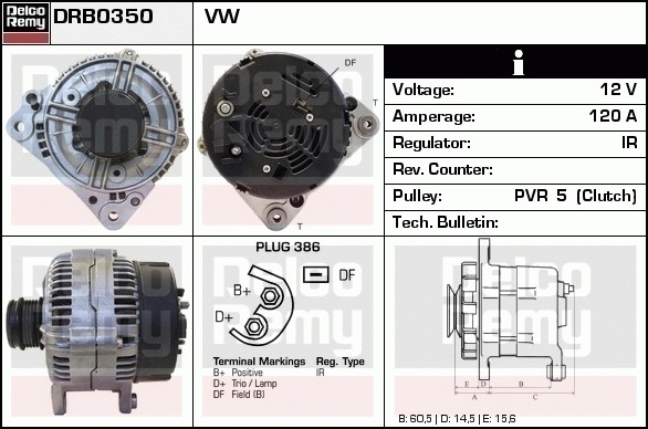 Dodatkowe informacje o produkcie Alternator, Light duty Europe Reman DRB0350 DELCO REMY AUTOMOTIVE EUROPE
