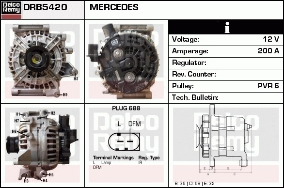 Dodatkowe informacje o produkcie Alternator, Light duty Europe Reman DRB5420 DELCO REMY AUTOMOTIVE EUROPE