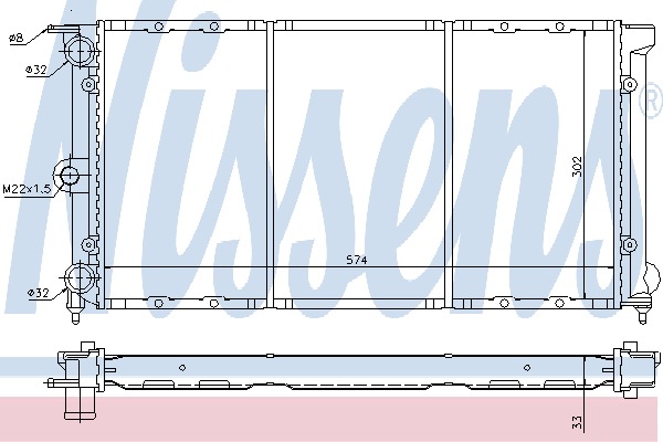 Rodzaj skrzyni biegów:przekładnia mechaniczna / opcjonalnie automatyczna Wyposażenie pojazdu:dla pojazdów bez klimatyzacji Materiał:miedz Materiał:tworzywo sztuczne Wymiary radiatora: 574 x 302 x 33 mm Wersja: Produced by Nissens Status produktu: nie dostarczane więcej przez producenta zastąpiony przez 652611